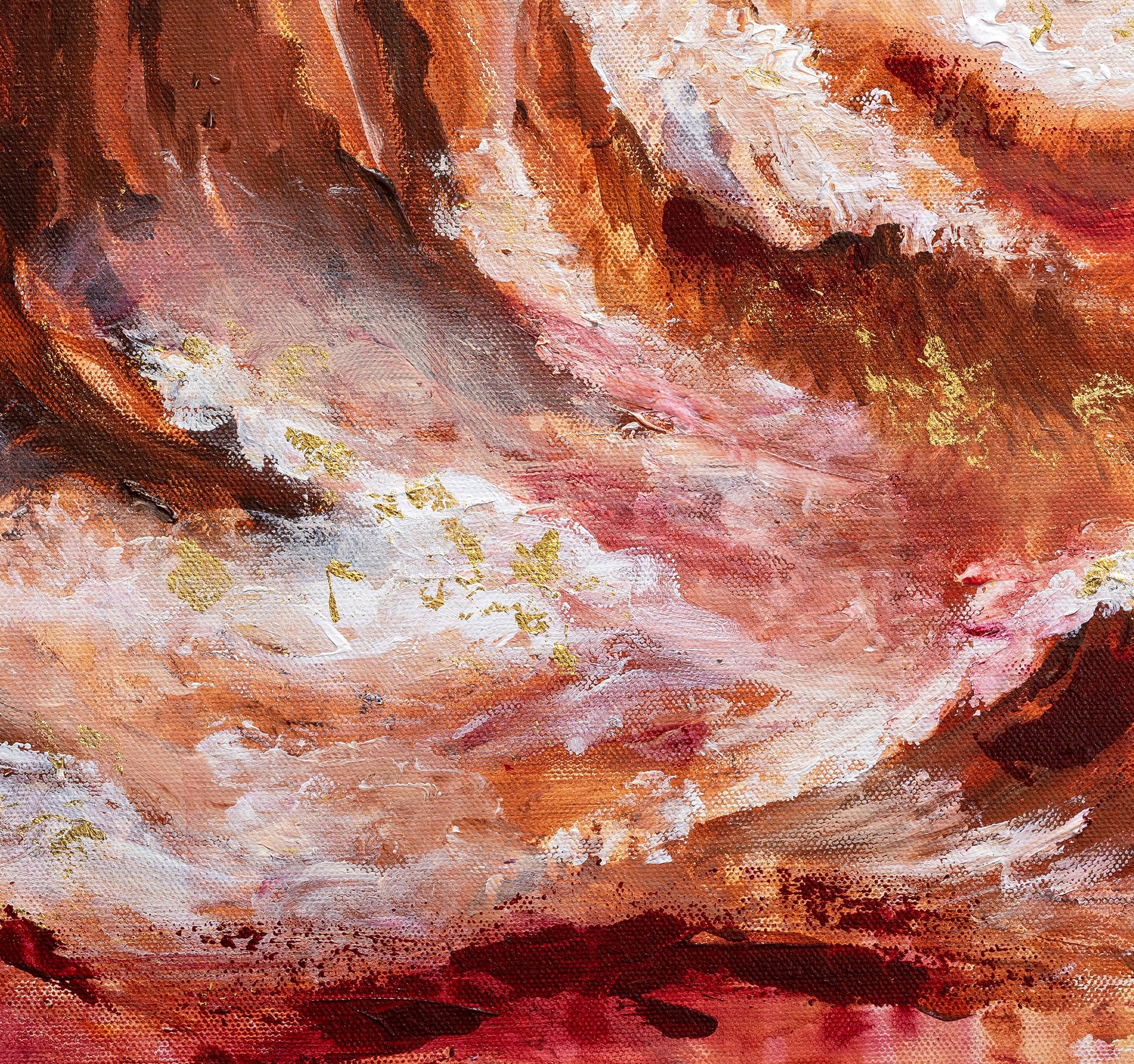 The entire landscape is in motion, alive with energy — because true gratitude is alive. It moves, it rises, it overflows. I used 24k gold leaf to bring that spiritual radiance into the painting, so the light doesn’t merely sit on the surface; it becomes part of the emotion, the prayer itself.